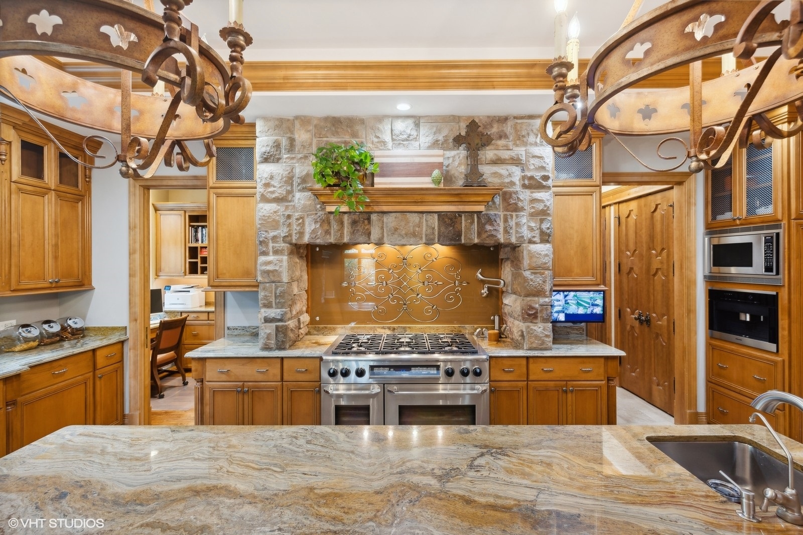 Step into a world of elegance and grandeur with this exceptional limestone estate, perfectly positioned on a 100*187 corner lot in the Forest Hills neighborhood of Western Springs. This residence embodies luxury living, showcasing impeccable design and superior craftsmanship at every turn. As you approach the home, the magnificent limestone facade & slate roof immediately captures your attention, exuding timeless charm and sophistication. The expansive driveway leads to a 4-car attached heated garage. Upon entering the home, you are greeted by a grand foyer that sets the tone for the rest of this exquisite home. The sweeping walnut staircase, adorned with ornate wrought iron railings, serves as a stunning focal point. The foyer's soaring ceilings, stained glass window and Royal Oyster marble flooring enhance the sense of opulence. To the left of the foyer is distinguished office space featuring exquisite herringbone walnut floors and custom cabinetry. The formal dining room beckons with its rich walnut flooring with red birch inlay. This dining space is perfect for hosting elegant dinner parties and family gatherings. As you walk through the foyer, you are welcomed into the heart of the home; with a chef's kitchen that is functional and beautiful. Featuring Dacor oven, Miele coffee system, two Miele dishwashers, Sub-Zero refrigerators and freezers, and surrounded with stained maple kitchen cabinetry & a spacious island featuring bamboo granite countertops. Adjacent to the kitchen, is another office space complete with pocket door for privacy. The hand scraped Walnut floors continue to flow to the sun-drenched dinette overlooking the luscious & manicured private yard. The kitchen flows seamlessly into the great room, where a dual floor to ceiling Rock Face Limestone fireplace is shared with a sunroom that showcases Slate Flooring. Both of these spaces create a warm and cozy luxurious atmosphere, ideal for relaxation or entertaining guests. Making your way up the grand staircase you will find the primary bedroom suite that is a true sanctuary featuring custom limestone fireplace with custom framing for TV, a lavish spa-like bathroom with a soaking tub, dual vanities, a walk-in shower with radiant heated bench. The incredible walk in closet will captivate you with all of the space you'll need. The other four spacious bedrooms feature walk-in closets, ensuite bathrooms, with two of the bedrooms sharing a convenient Jack & Jill bathroom. The second floor also offers a full laundry room complete with dual washers & dryers w Antique Saturnia Travertine floors. The finished third level offers vast storage space. Conveniently make your way down to a luxurious lower-level retreat on the second all walnut staircase. This basement is a homeowner's dream, designed with meticulous attention to detail and high-end finishes throughout. Enjoy a serene escape with a spacious bedroom and an indulgent full bath, featuring a large walk-in, resort-style steam shower. The full kitchen boasts top-of-the-line appliances, including another Sub-Zero refrigerator, providing ample storage and convenience. The custom bar area is finished in Rock Face limestone to match the home's exterior and bar area. This features a vibrant game room and a state-of-the-art movie theater for the ultimate cinematic experience. Stay active and entertained with a professional-grade golf simulator and a spacious workout room. Connoisseurs will appreciate the wine cellar that can hold 600 bottles. The thoughtfully designed kid's space includes a cozy nook and craft room. Adding to the charm, a cozy fireplace, also finished in Rock Face limestone. Lastly, you will discover your private oasis in this beautifully landscaped backyard, featuring built-in gas fireplace, grill station, and Kamado Joe. The Victorian greenhouse, imported from England, adds a touch of classic charm, all surrounded by vibrant foliage that creates your own English garden right in Western Springs.